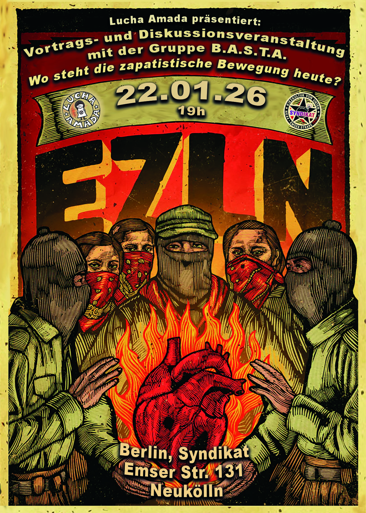 Veranstaltungsankündigung in Berlin: https://luchaamada.wordpress.com/next-dates/ Lucha Amada präsentiert: 22.01.26 19h Berlin, Syndikat (Emser Strasse 131, Neukölln)Land und Freiheit! – Tierra y Libertad! Wo steht die zapatistische Bewegung heute? Warum erhoben sich am 1. Januar 1994 Zehntausende indigene Kleinbäuer*innen, die sich nach dem Revolutionsgeneral Emiliano Zapata ›Zapatistas‹ nennen, im südmexikanischen Chiapas zu ihrer Rebellion unter der Losung… Wo steht die zapatistische Bewegung heute? weiterlesen
