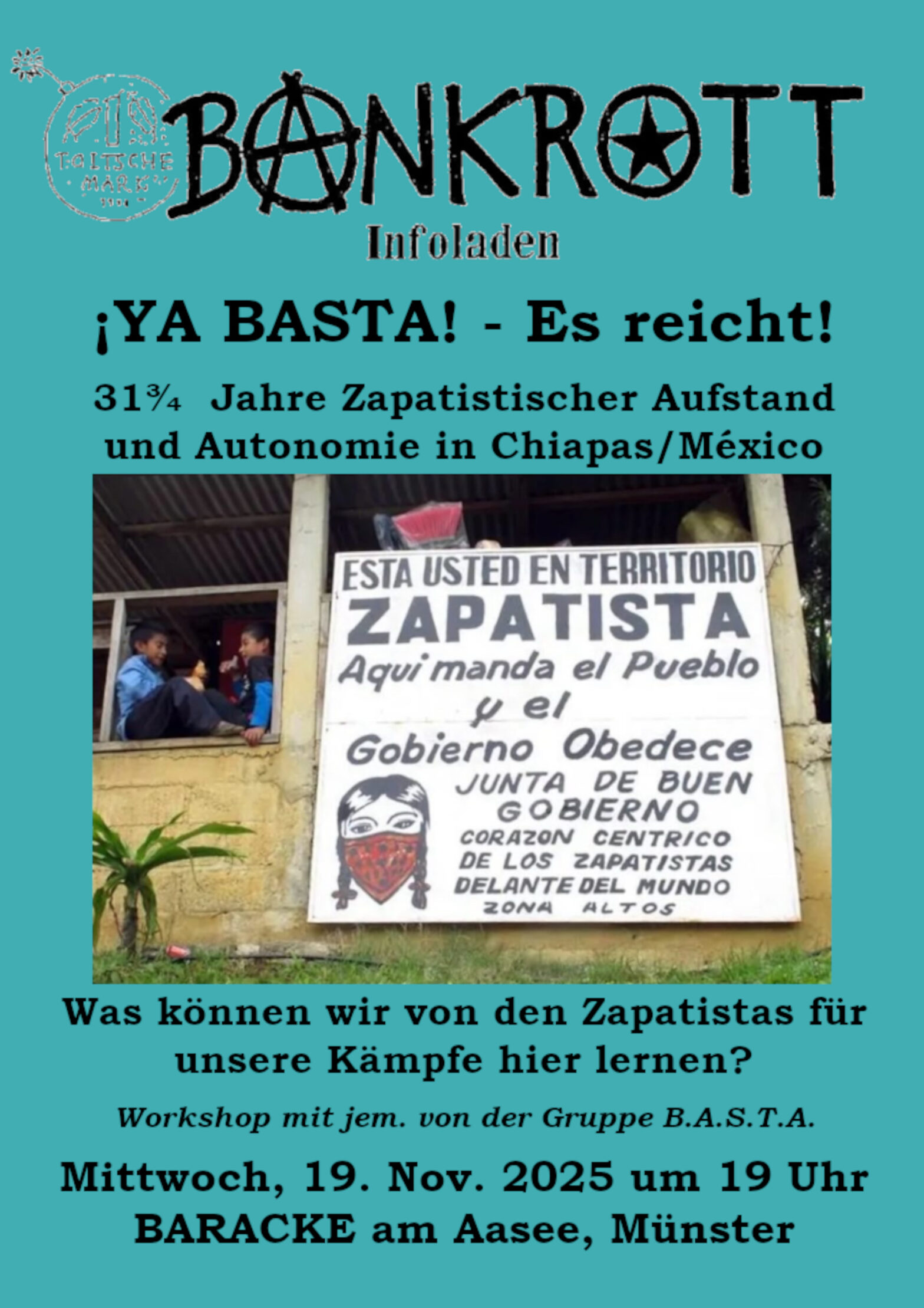 31¾ Jahre Zapatistischer Aufstand und Autonomie in Chiapas/México – Was können wir von den Zapatistas für unsere Kämpfe hier lernen? Am 1. Januar 1994 fand im Süden Mexikos ein Aufstand statt, der die Welt verändern sollte. Dort wurde der Kolonialismus besiegt. Und seitdem sich die Zapatistas dort selbst regieren, ist der Kapitalismus abgeschafft. Und es… ¡Ya Basta! – Es reicht! weiterlesen